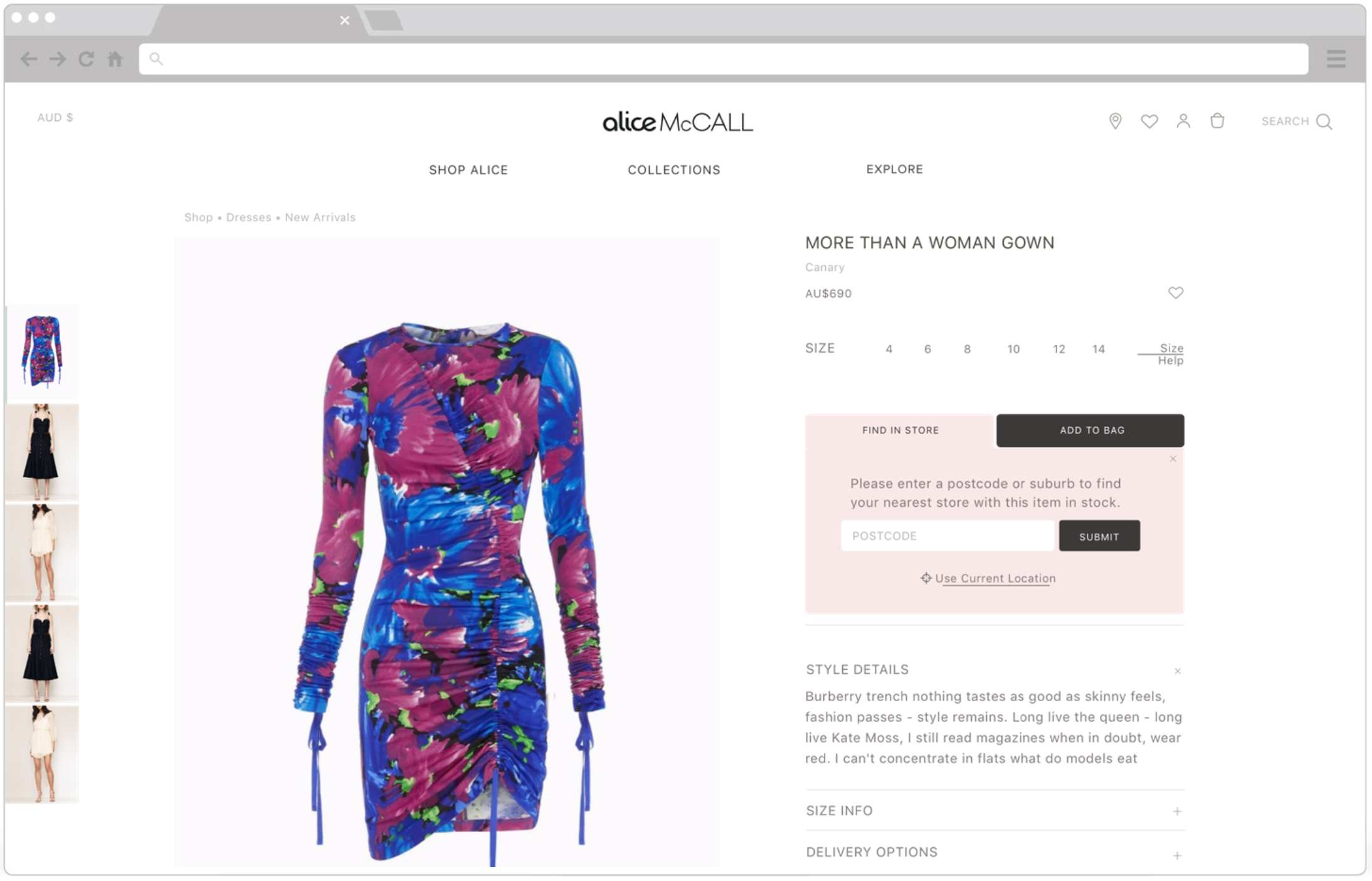 In collaboration with the agency Bashful, I played a pivotal role in the replatforming of Alice McCall's website from Magento to Shopify. Although the brand faced unfortunate closure due to the impact of COVID, I seized the opportunity to contribute to their digital transformation. Initially hired as a freelancer to assist their UX team with research and wireframing, my involvement deepened during the UI phase. Drawing upon my expertise, I crafted an exceptional UI Kit that served as the foundation for a comprehensive rebranding of the label. Through this project, we aimed to revitalize the brand's online presence and create a visually captivating and cohesive user experience that would resonate with Alice McCall's devoted following.